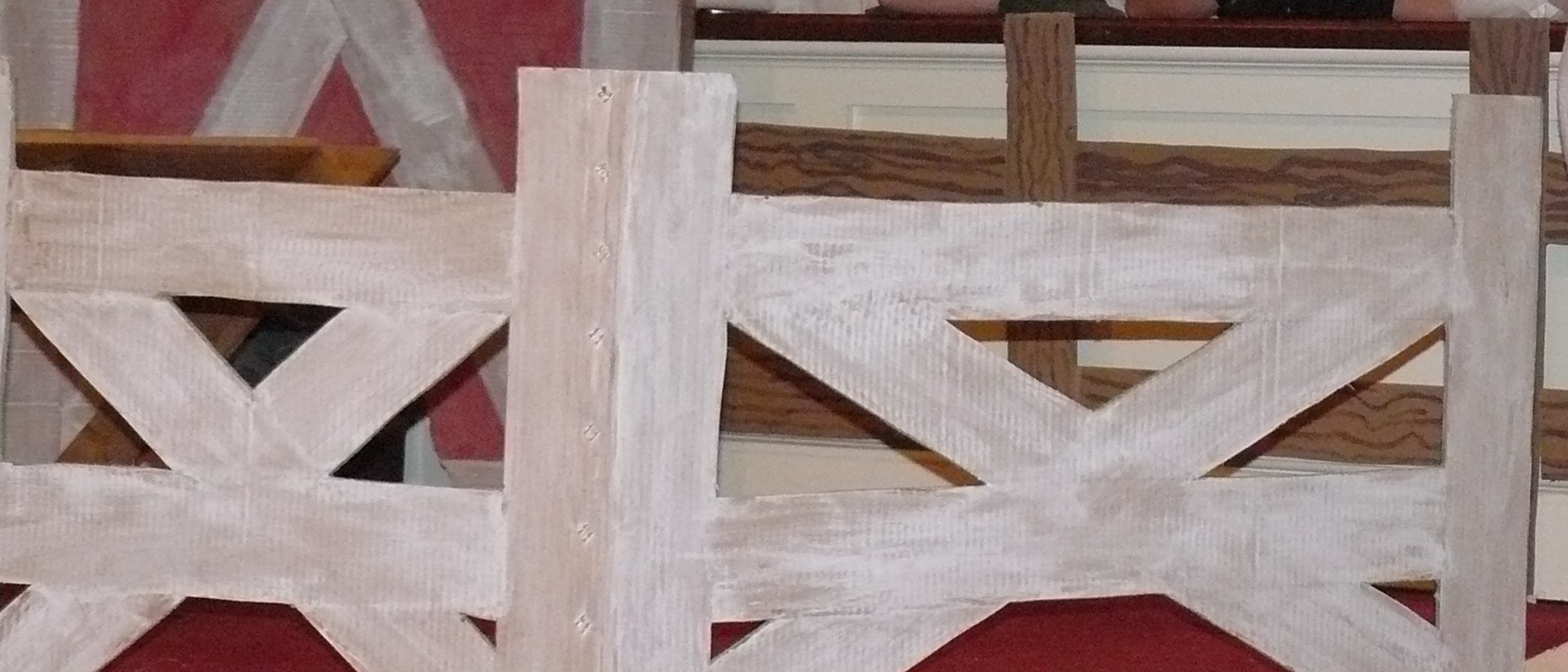 Since we had a small stage and were trying to be efficient when changing scenes, I started thinking about how we could have one design that would work for a kitchen table, an animal crate, and a fence. The main part of the set was a barn, so these items helped change what was happening in each scene. I brought the idea to the art teacher, she brainstormed some ideas and the kids built and painted the final product. It was so cool! This meant there wasn’t a lot that we had to put on and take off the stage, since this one item could be used for most of the scenes. Being constructed from cardboard also made it very light.