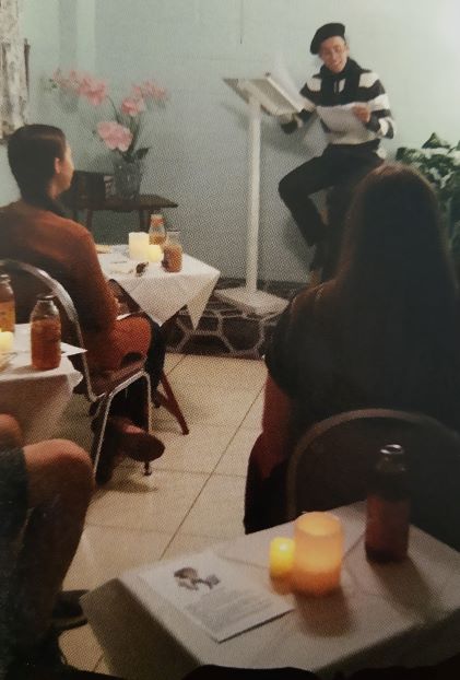 Another student after reading her poem commented that, “she got snaps, but he got claps.” In the Beatnik tradition, the snaps are supposed to be a quiet way to applaud the artist for something special. Unfortunately, this did not come across as special since the trash poet received an enthusiastic applause with a demand for more when he was done. This began the battle of the poems.