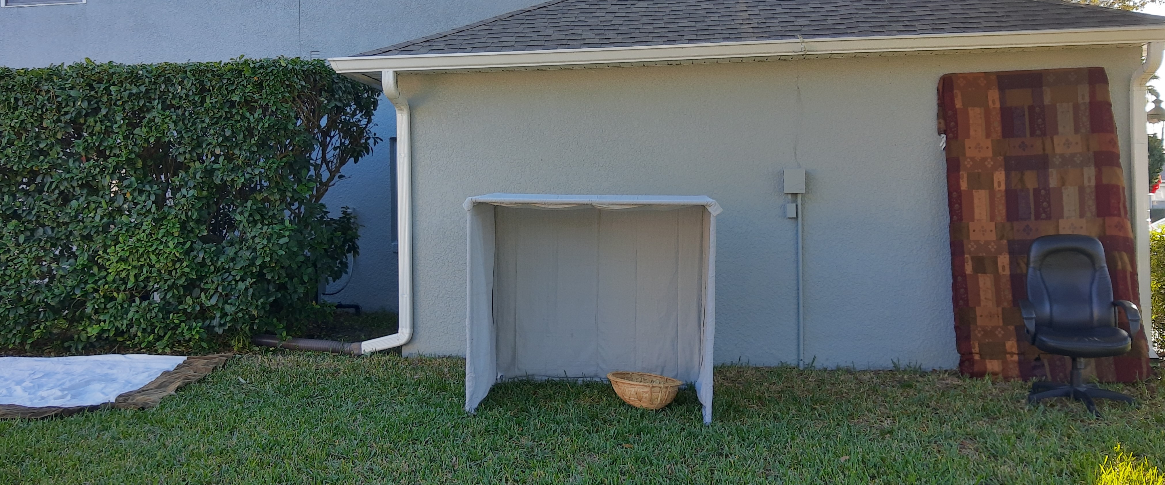 Instead of wood and a triangular construction, I chose to use the much lighter and cheaper PVC pipes and a rectangular construction for the room that holds the manger. After rethinking how to set it up in my yard, I found a great spot in front of our large bush for the field scene and used some plywood and a royal-looking comforter as the backdrop for Herod. The Herod backdrop idea came the night before the play.