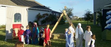 Outside the couple’s home, there was a set, costumes for the kids to wear and a narrator that would tell the story while the kids acted out their roles. Narrating made it easier to put on a performance with only an hour rehearsal time. The most important part was recruiting the neighborhood kids, and kids like mine who traveled to see it, to play the roles while the neighbors watched the show.
