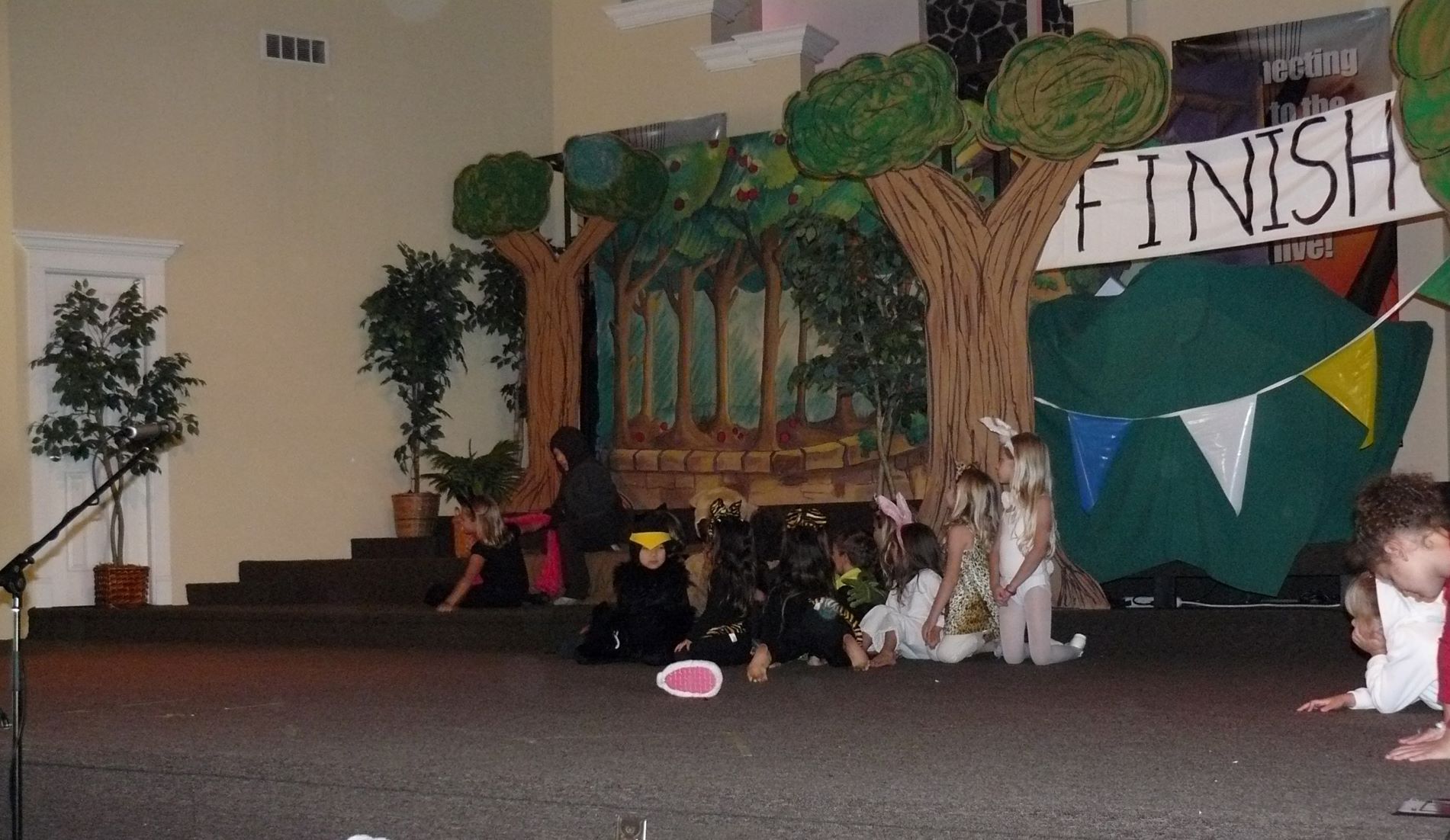 When students are involved in acting and designing sets, they understand what is needed for a scene and are motivated to get it done well. They learn to work within the parameters of the stage we have to work with and that a small stage can work just as easily as a large stage when thinking outside the box. We’ve had stages of all different shapes and sizes, along with aspects of the stage that had to be worked around like a lectern that could not be moved or a half wall with little doors that was the only way to access the back of the stage. We’ve also performed in a fellowship hall, living room and outside. Working with the stage we were given actually created a lot of fun ideas that we may not have thought of with a normal stage.