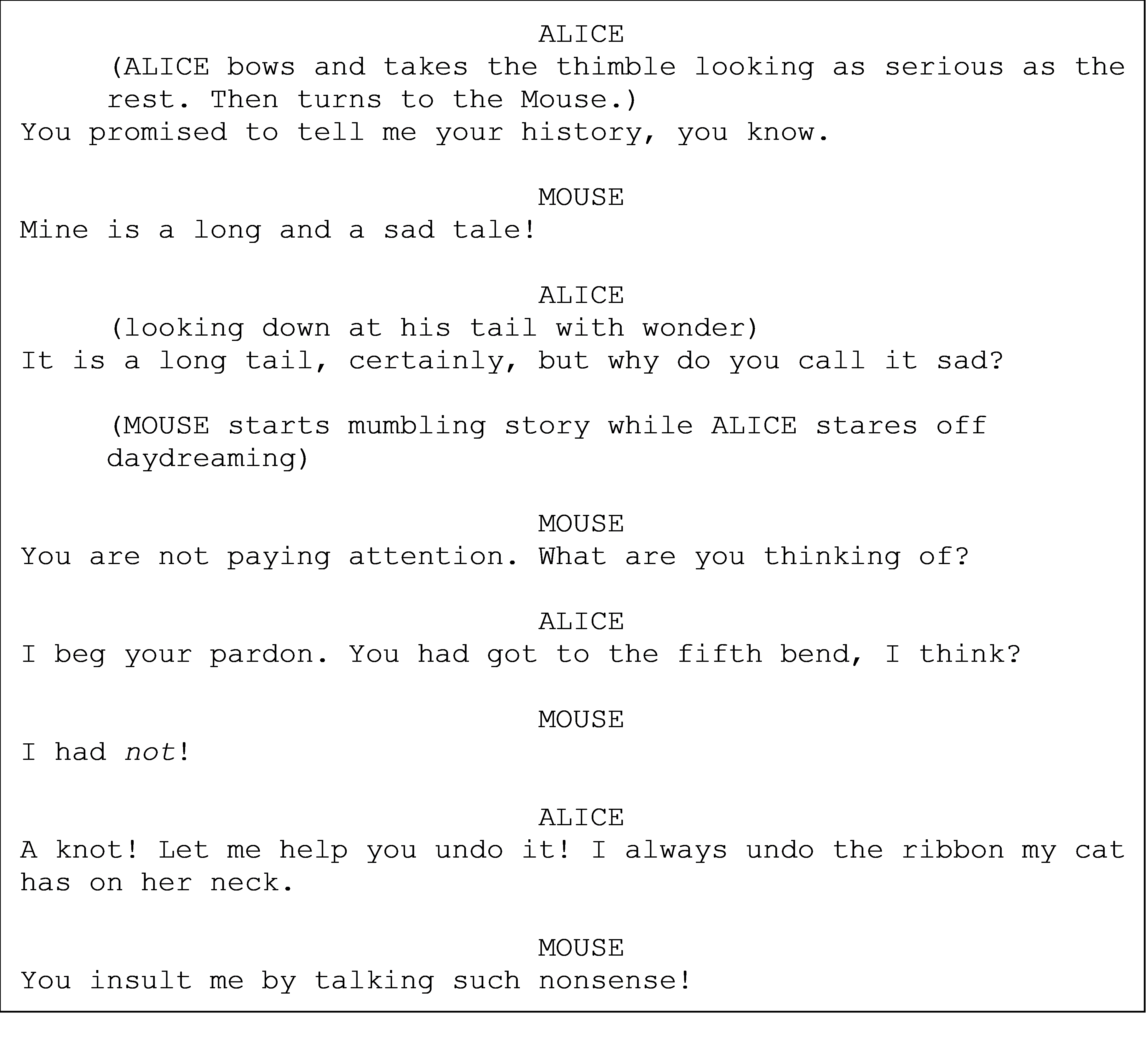 Ex. Here’s an example from my 30-minute play Alice's Adventures in Wonderland, based on Lewis Carroll’s book:
